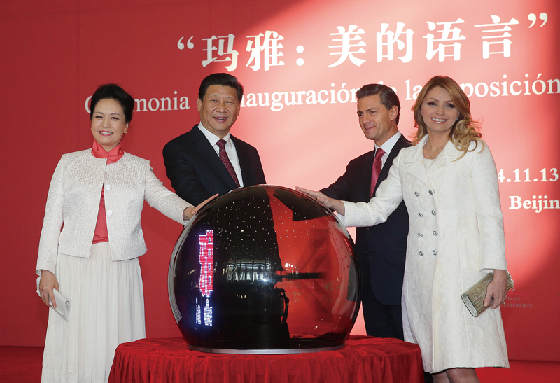 2014年11月13日,國家主席習近平同墨西哥總統培尼亞共同出席在國家博物館舉行的“瑪雅:美的語言”文化展開幕式。這是習近平和夫人彭麗媛與培尼亞夫婦一同為展覽剪彩。 新華社記者 劉衛兵/攝