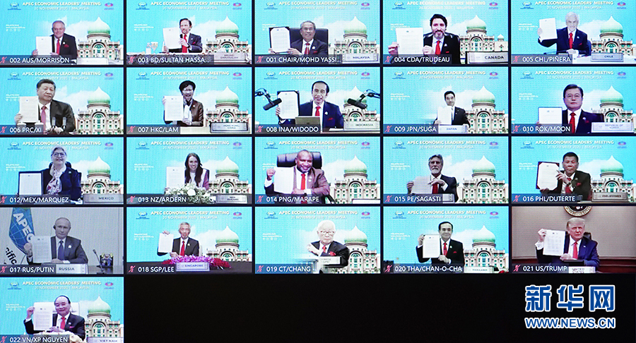 11月20日晚,國家主席習近平在北京以視頻方式出席亞太經合組織第二十七次領導人非正式會議并發表重要講話。這是與會各經濟體領導人、代表通過《2040年亞太經合組織布特拉加亞愿景》并線上合影。 新華社記者 李響 攝