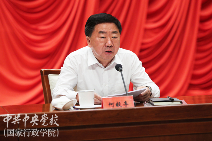 何毅亭指出,中央黨校(國家行政學院)要按照中央精神,牢牢把握“守初心、擔使命,找差距、抓落實”這一總要求,牢牢把握深入學習貫徹習近平新時代中國特色社會主義思想、錘煉忠誠干凈擔當的政治品格這一總任務。他說,黨中央明確規定中央黨校(國家行政學院)是黨中央直屬單位,也就是說是黨中央直接管理的學校,“姓黨”是校(院)最鮮明的政治底色。我們要通過這次主題教育,使全校黨員干部進一步牢固樹立黨校姓黨意識,把做到“兩個維護”作為校(院)建設第一位的政治要求來貫徹,把堅持黨校姓黨作為衡量校(院)工作質量和成效的根本準繩來把握,切實使主題教育成為一次思想的再洗禮、一次初心的再覺醒、一次使命的再升華、一次忠誠的再淬煉。