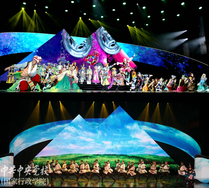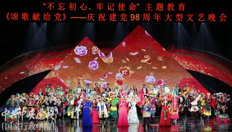 為隆重慶祝建黨98周年,喜迎新中國成立70周年,作為中央黨校(國家行政學院)“不忘初心、牢記使命”主題教育的一項重要內容,7月2日晚,校(院)特邀中央民族歌舞團來校舉辦《頌歌獻給黨》主題晚會。本次演出由中央黨校(國家行政學院)、國家民族事務委員會、文化和旅游部共同主辦,由中央黨校(國家行政學院)主題教育領導小組辦公室、圖書和文化館具體承辦。中央黨校(國家行政學院)副校(院)長王東京、甄占民、李季、謝春濤,國家民族事務委員會專職委員孫學玉,中央民族歌舞團黨委書記黃耀平、副團長王成剛,校(院)各直屬單位領導及黨組織負責同志、全體學員約1900人觀看了演出。
