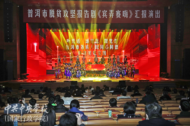 12月20日,由云南省普洱市創(chuàng)作的脫貧攻堅報告劇《賓弄賽嗨》在中央黨校(國家行政學院)北校區(qū)禮堂演出。分管日常工作的副校(院)長何毅亭,副校(院)長甄占民、李季、李毅、謝春濤,中國農(nóng)業(yè)銀行行長張青松,國家開發(fā)銀行副行長周清玉,以及駐京有關定點幫扶單位代表、全體在校學員一同觀看演出。