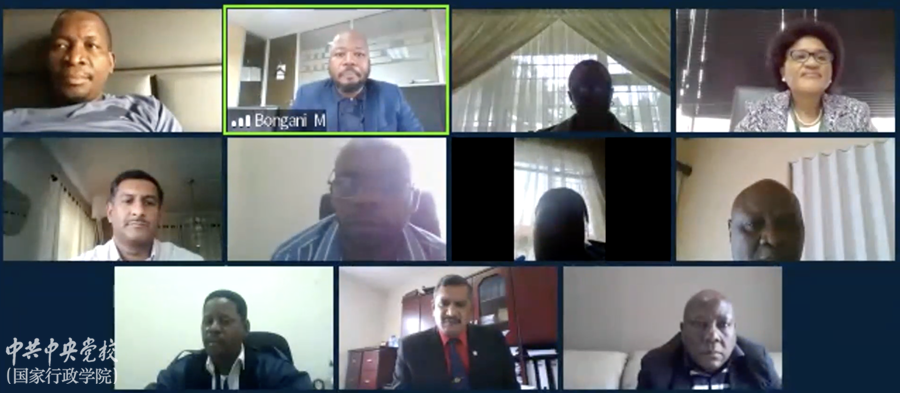 本期線上培訓班由國際合作部與國際和港澳培訓中心共同舉辦,共有37名來自南非中央和地方政府相關部門的中高級公務員參加培訓。培訓班為期10天,共開設9節講座和1次線上論壇,邀請了我校(院)學術與英語能力都過硬的專家學者,以英語直接授課。開班式結束后,時和興副秘書長以“習近平治國理政思想”為題,為培訓班講授了第一課。