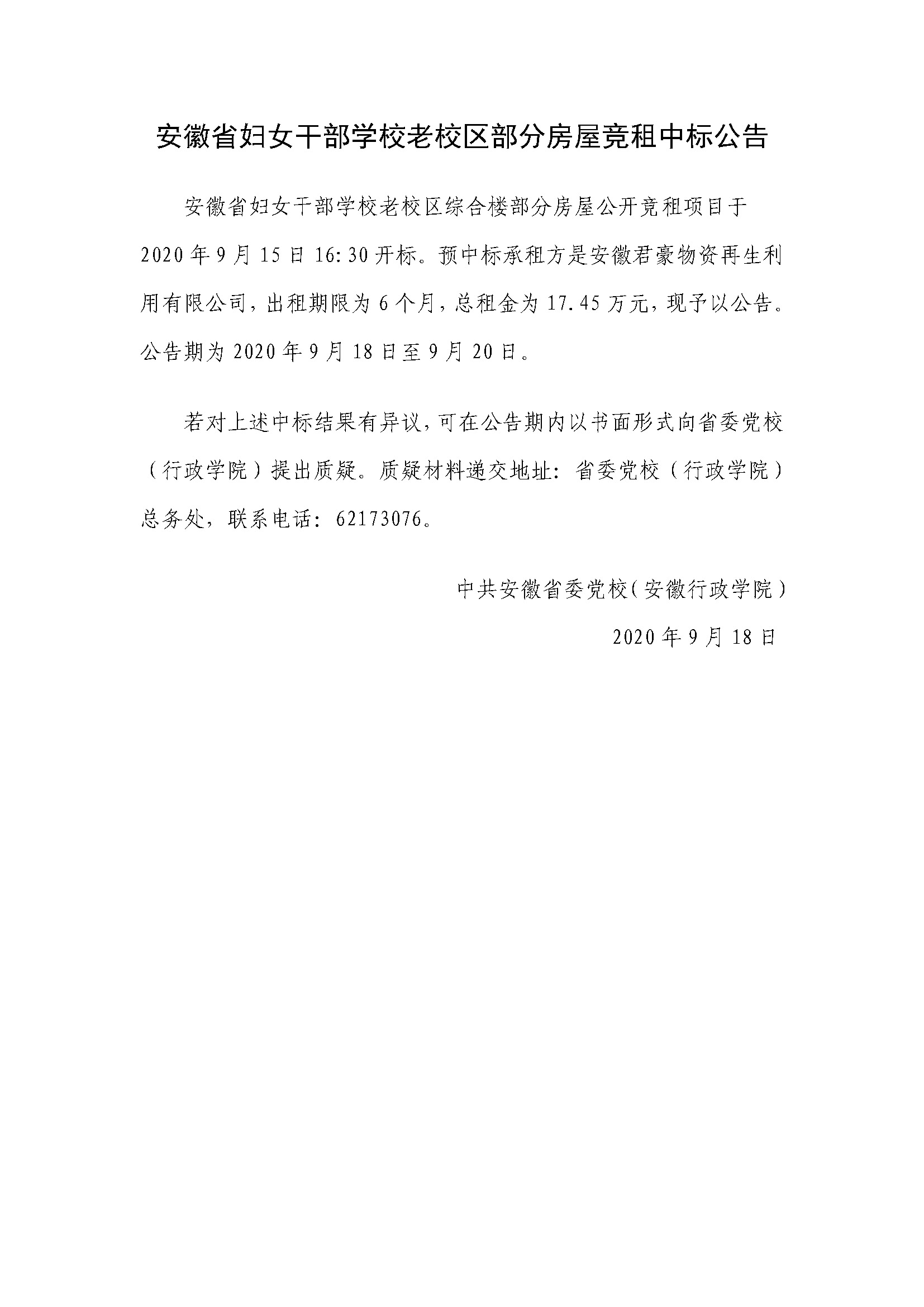 安徽省婦女干部學校老校區部分房屋競租中標公告