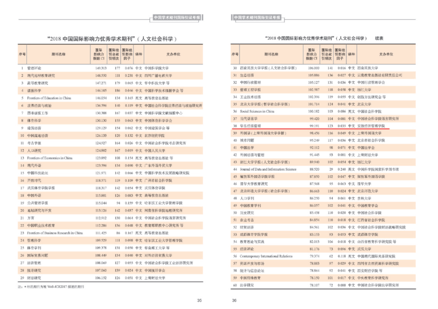 近日,由中國學術文獻國際評價研究中心、清華大學圖書館研制,《中國學術期刊(光盤版)》電子雜志社有限公司出版的《中國學術期刊國際引證年報》(2018)發布,《華東經濟管理》獲評“2018中國國際影響力優秀學術期刊”(人文社會科學)。