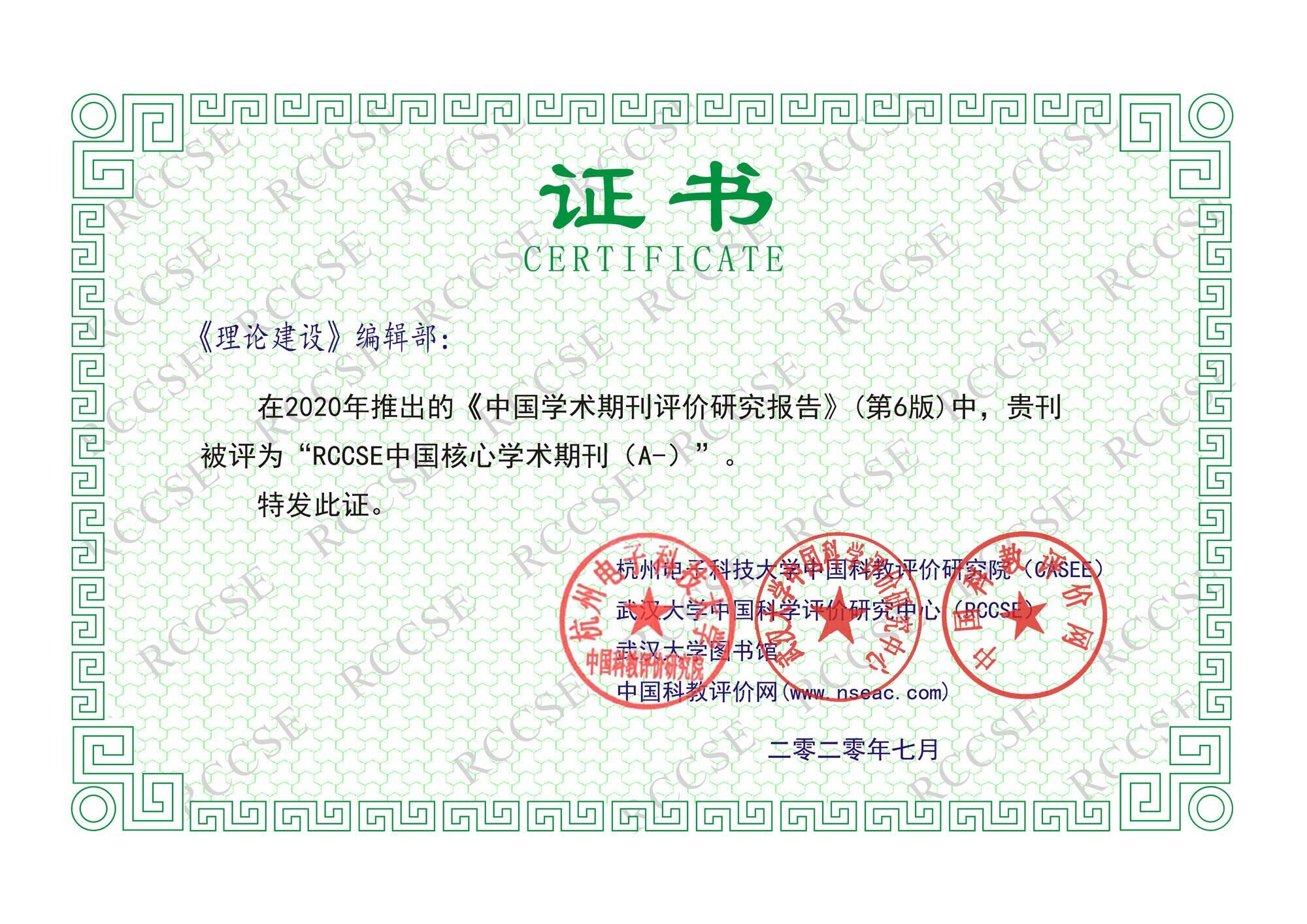 近日,由武漢大學(xué)中國科學(xué)評價研究中心(RCCSE)推出的《中國學(xué)術(shù)期刊評價研究報告》(第6版)正式對外發(fā)布,《理論建設(shè)》獲評“RCCSE中國核心學(xué)術(shù)期刊(A-)”,首次入選中國核心學(xué)術(shù)期刊,實(shí)現(xiàn)了新突破。