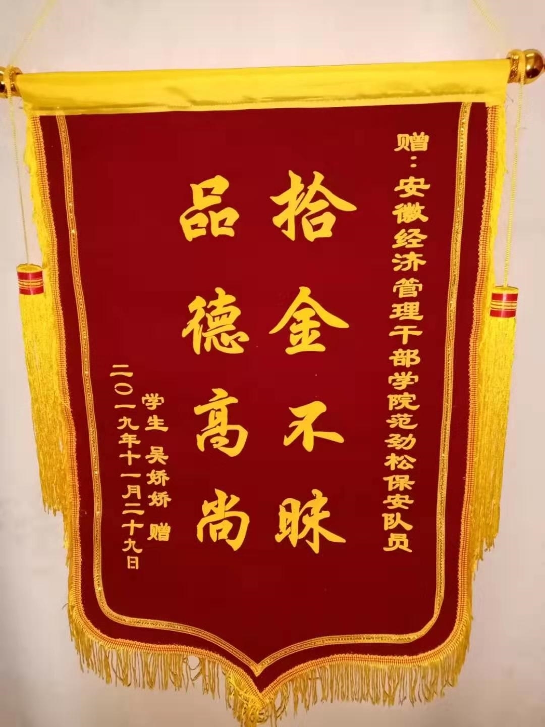 11月29日上午十點左右,省委黨校(安徽行政學院)西校區保安人員范勁松在北大門執勤過程中,撿到智能手機一部(價值三千余元)。范勁松立即和保安隊長說明情況,并將手機上交登記。很快失主(安徽經濟管理學院社工系文秘六班學生)打來了電話,經保安隊核實無誤后,通知失主前來認領并現場歸還。12月2日晚,失主特意定制一面錦旗送給范勁松,贊揚其高尚的品德和拾金不昧的精神。