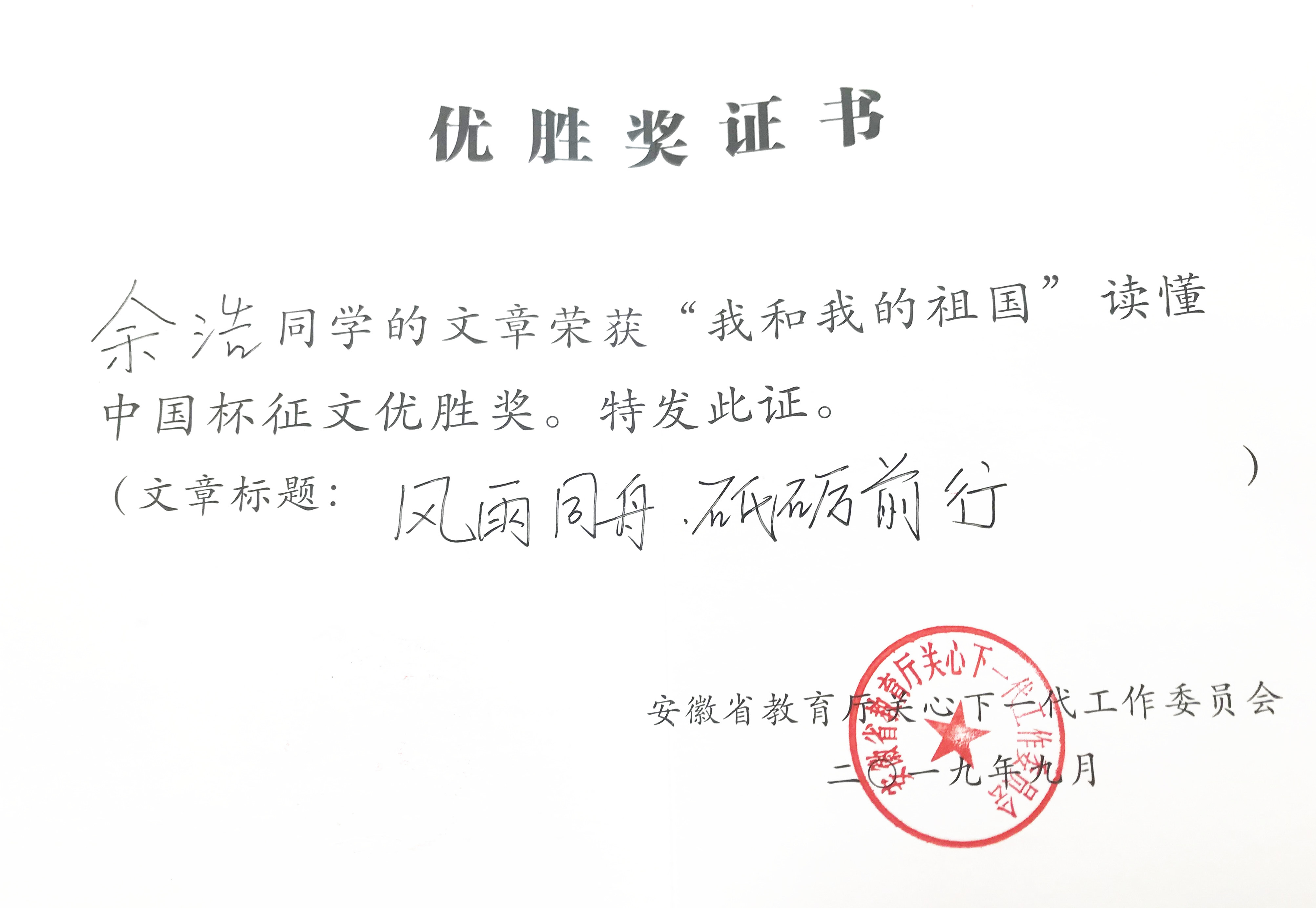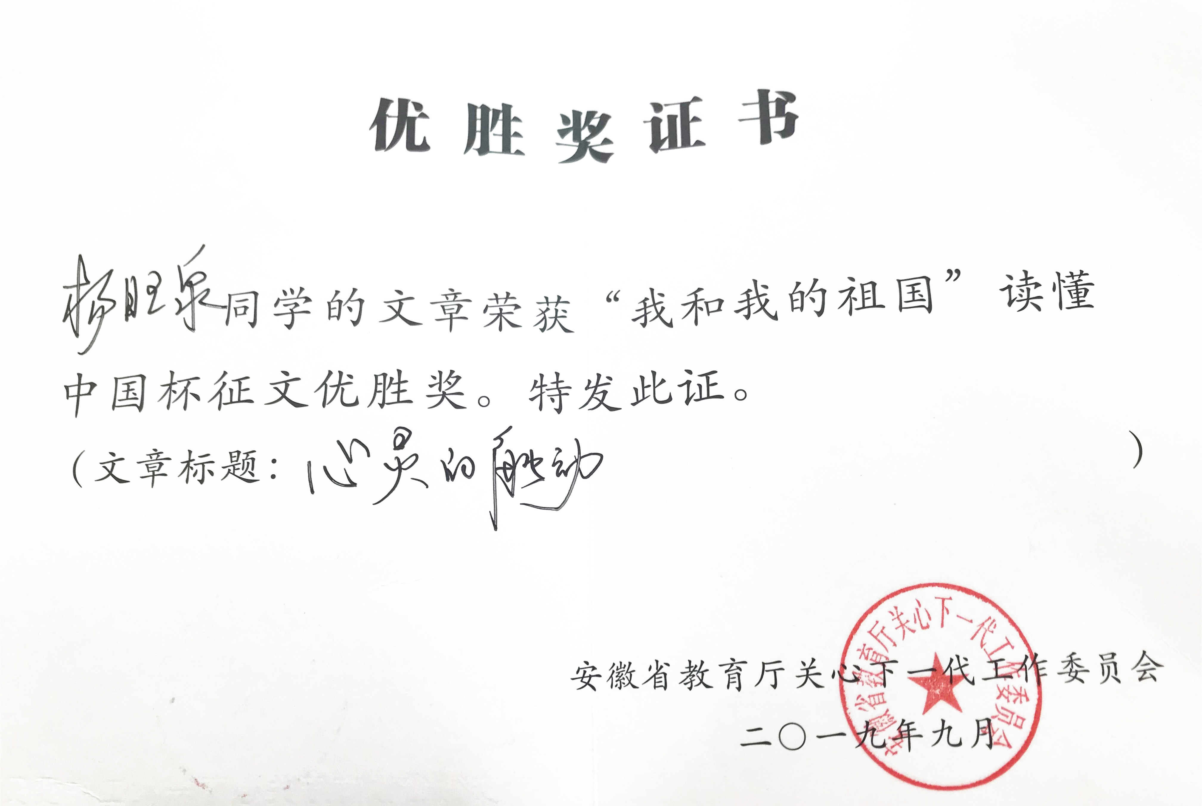 為慶祝中華人民共和國成立70周年,安徽省教育廳關工委在全省高校組織開展了以“我和我的祖國”為主題“的讀懂中國”教育活動。安徽經濟管理學院關工委、團委組織各系學生積極參與投稿。經過評比,社會與公共管理系2018級人力資源管理專業余浩同學作品《風雨同舟砥礪前行》、經濟管理系2018級工商企業管理專業楊旺泉同學作品《心靈的觸動》喜獲優勝獎。