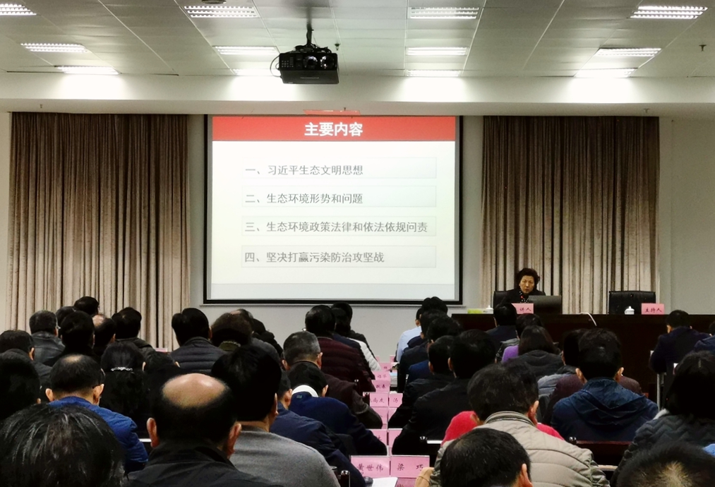 徐恒秋緊緊圍繞學習貫徹習近平生態(tài)文明思想,全面闡述了當前生態(tài)環(huán)境保護取得的成就及生態(tài)環(huán)境形勢和問題,深度解讀了生態(tài)環(huán)境政策法律和依法依規(guī)問責、堅決打贏污染防治攻堅戰(zhàn)等方面內(nèi)容。她指出,生態(tài)環(huán)境是關系黨的使命宗旨的重大政治問題,也是關系民生的重大社會問題,必須把生態(tài)文明建設擺在全局工作的突出地位,積極回應人民群眾所想、所盼、所急,大力推進我省生態(tài)文明建設。