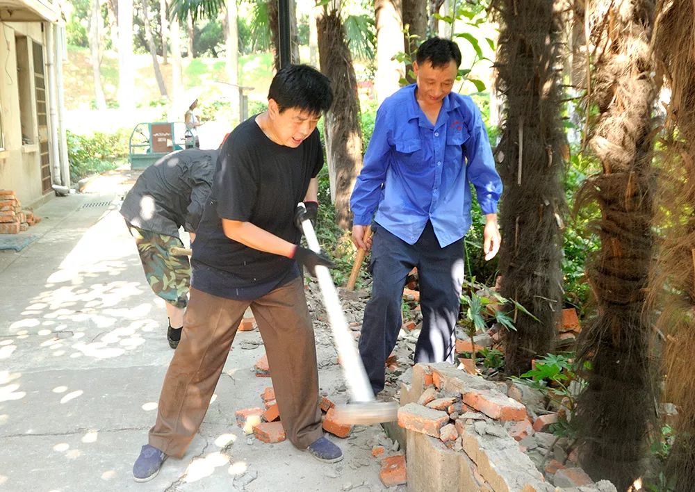 校1號樓前,機關服務中心維修工程部的瓦工師傅正全力以赴搶修圍墻。