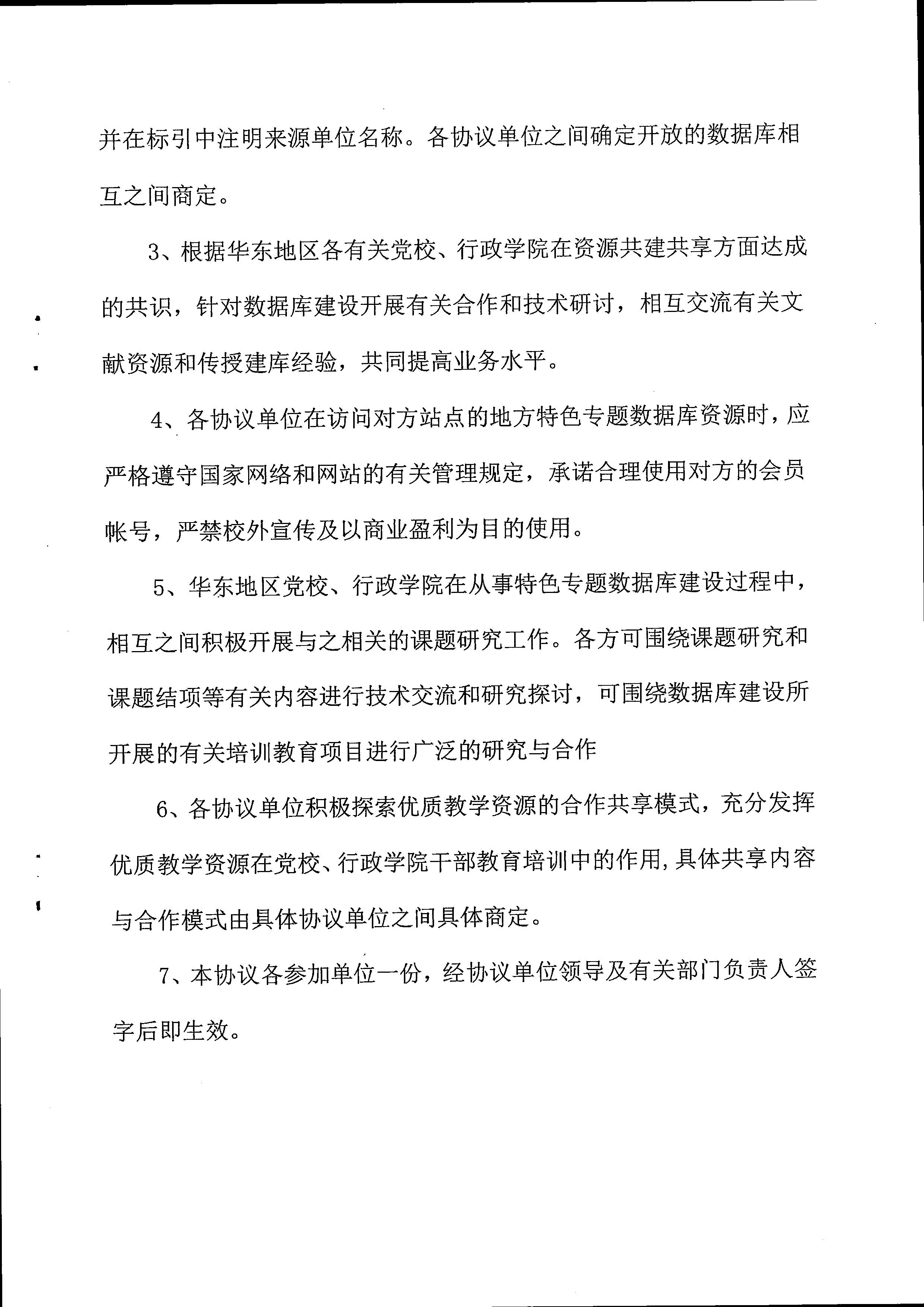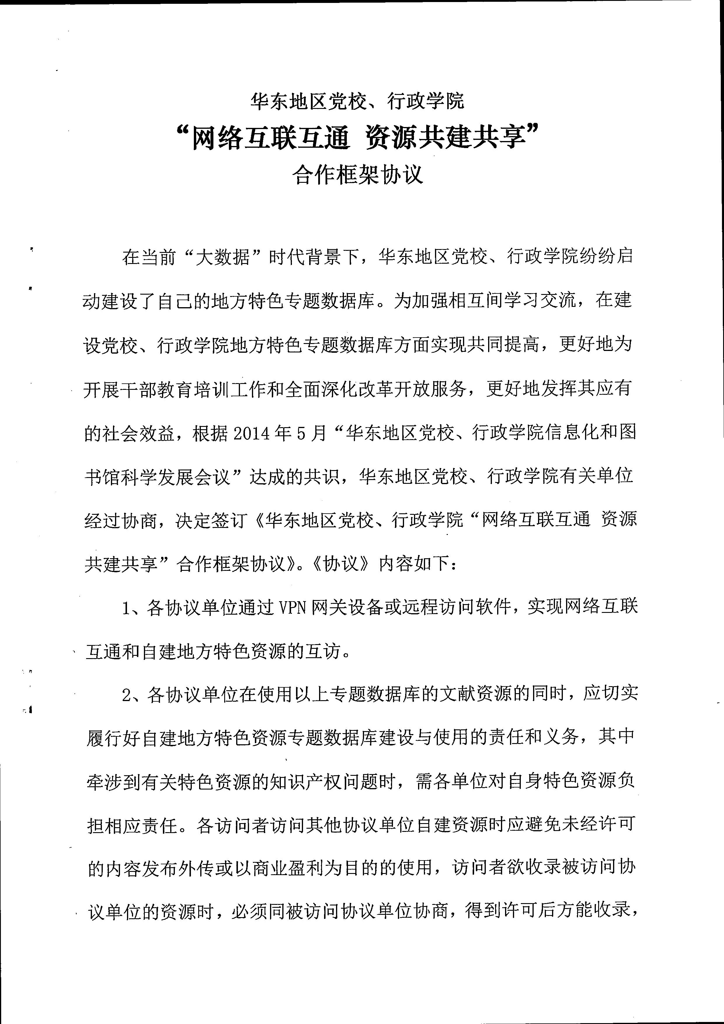 ?? 我校按照2014年5月華東地區黨校、行政學院信息化和圖書館科學發展會議上簽訂的“網絡互聯互通 資源共建共享”合作框架協議(如下兩圖)要求,對簽訂協議的首批9家單位的數字資源實現相互訪問。