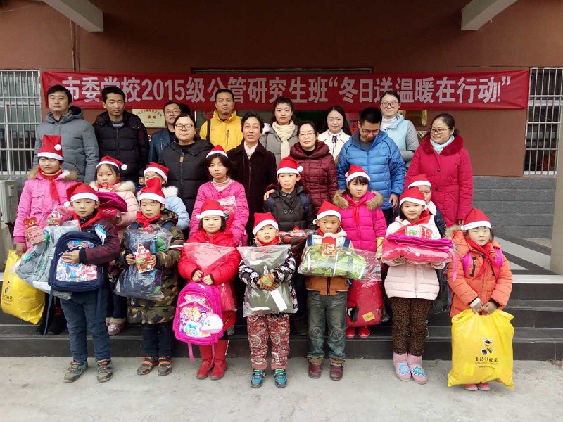 ??12月24日,省委黨校淮南教學點2015級公共管理專業(yè)在職研究生學員代表在市委黨校王寶娟副校長、研究生辦副主任劉梅和班主任曹亢亢的帶領下,赴鳳臺縣新集鎮(zhèn)開展“冬日送暖在行動”活動。