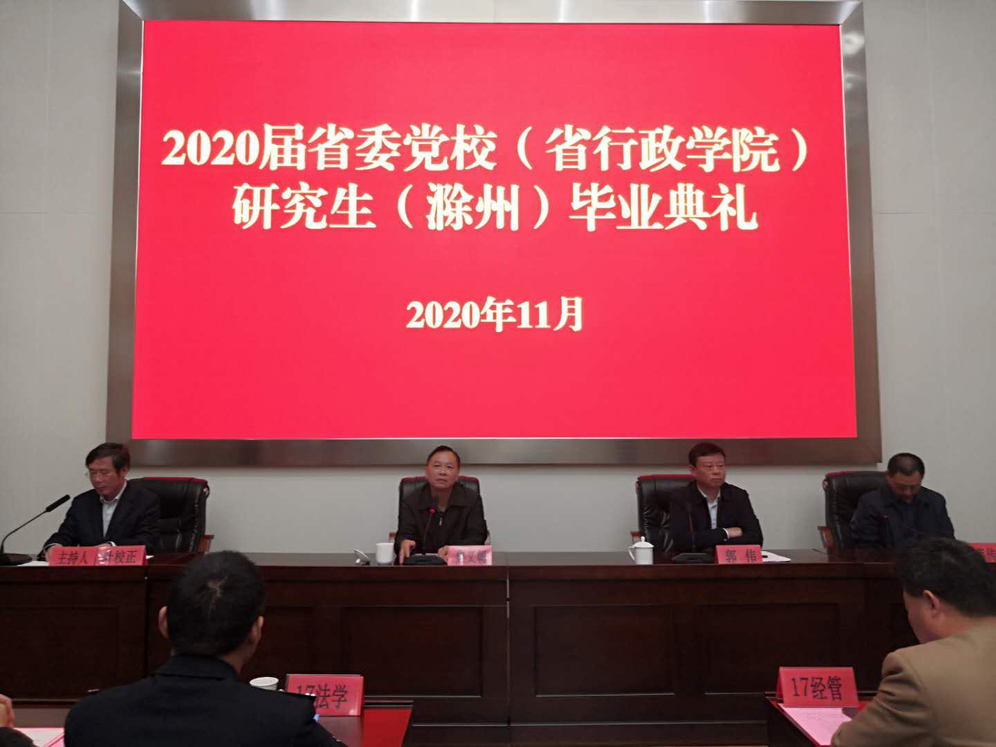 2020年11月7日上午,安徽省委黨校在職研究生滁州教學點2020屆研究生畢業典禮在市委黨校205報告廳舉行。滁州市委黨校(滁州市行政學院)常務副校長焦義朝、安徽省委黨校(安徽省行政學院)研究生部主任郭偉出席,2020屆法學和經管專業共140名學員參加畢業典禮。