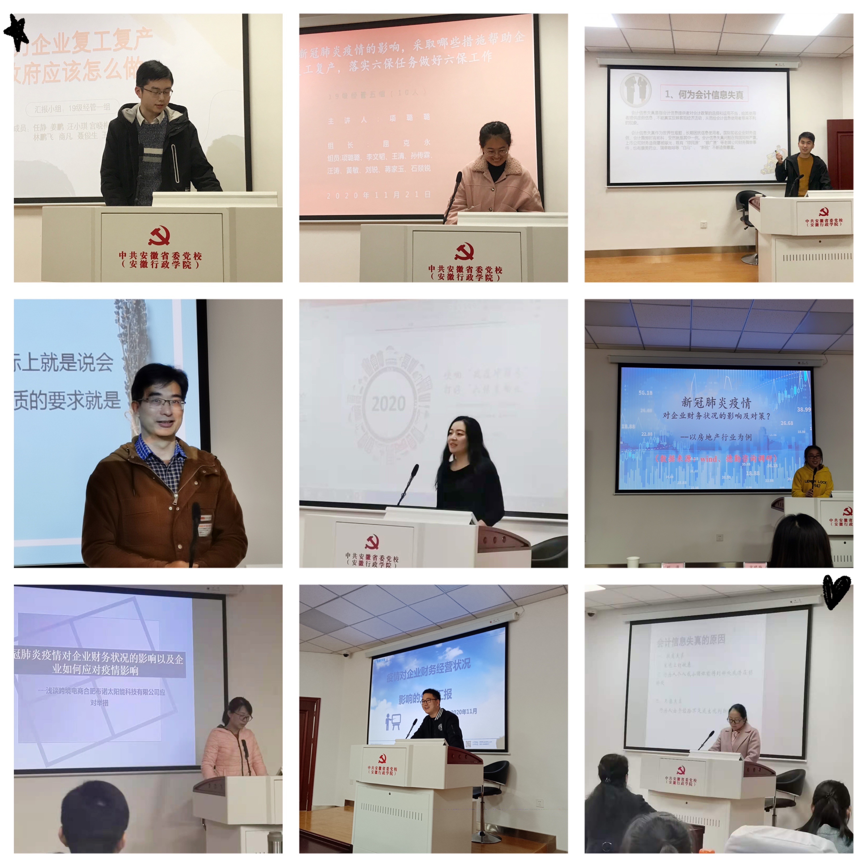 經(jīng)過細(xì)致的調(diào)研和集體的探討,9個學(xué)習(xí)小組逐一上臺展示學(xué)習(xí)成果,現(xiàn)場演講與實時答疑同步開展,充分展現(xiàn)出同學(xué)們務(wù)實的學(xué)習(xí)精神、開闊的思維方式、跳躍的創(chuàng)新理念。例如,以實體企業(yè)藍(lán)鼎環(huán)保為例,闡述疫情對企業(yè)財務(wù)資金周轉(zhuǎn)、施工項目進(jìn)展等帶來的影響和應(yīng)對舉措;以合肥市國資委下屬國有企業(yè)為例,回顧疫情期間國企的“民生擔(dān)當(dāng)”,以及“疫后花開”持續(xù)向小微企業(yè)“輸血”并加快水電氣熱公共交通等民生工程建設(shè)進(jìn)度,讓民生長卷在六穩(wěn)六保中步步生花;深挖企業(yè)會計信息失真可能存在的主觀和客觀因素,追根溯源防微杜漸等。各小組的展示亮點紛呈、現(xiàn)場答疑妙語連珠,博得滿堂彩。