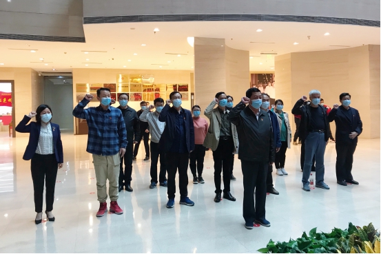 在渡江戰役紀念館大廳的黨旗前,支部書記蔣俊領誓,全體黨員重溫入黨誓詞,牢記初心使命。